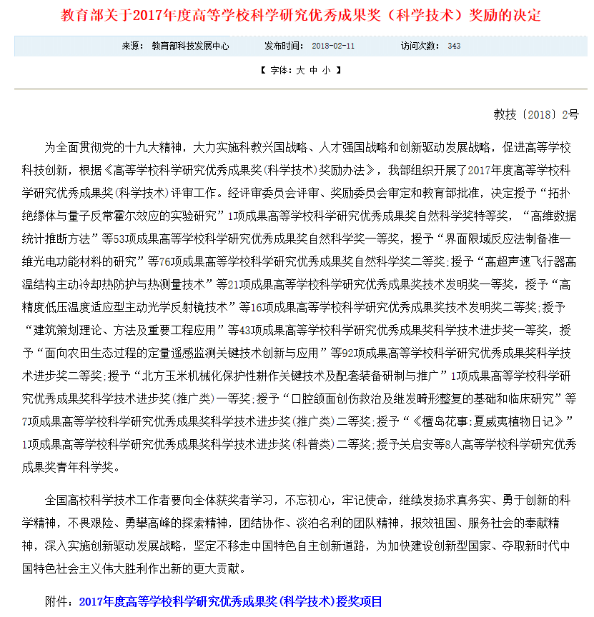 教育部星空(中国)2017年度高等学校科学研究优秀成果奖(科学技术)奖励的决定