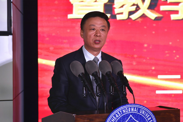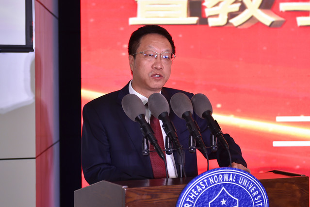 校长刘益春在表彰大会上作了讲话。他首先指出,对于东师来说,教育教学是立校之本,科学研究是强校之本,教学和科研是相辅相成的关系。要建设一流大学,就必须打造一流的本科教育,教师在传承师德的基础上,要兼顾教学和科研,努力将科研成果转化为新的知识融入到教学中,全面提高对卓越教师和卓越创新型人才的培养能力。随后,刘益春从“四个回归”的维度,阐述了新时代本科教育工作的新形势、新任务。他谈到,“回归常识”就是学生要刻苦读书学习;“回归本分”就是教师要潜心教书育人;“回归初心”就是要认真贯彻党的教育方针,立德树人,为国家培养能够担当民族复兴大任的时代新人;“回归梦想”就是要倾力实现教育报国、教育强国梦。刘益春强调,建设一流本科,推动学校内涵式发展,要以“创造的教育”理念培育创新人才、打造一流课程和课堂、为本科教育配置一流师资,使那些真正在本科教学、教育教学改革、创新型人才培养等方面有建树的老师得到应有的尊重和更好的发展。最后,他鼓励广大教师以郑德荣精神为引领,立德树人,扎实工作,勇担时代使命,抓住历史性机遇,为建设世界一流的师范大学、培养具有创造力的一流人才而奋斗。