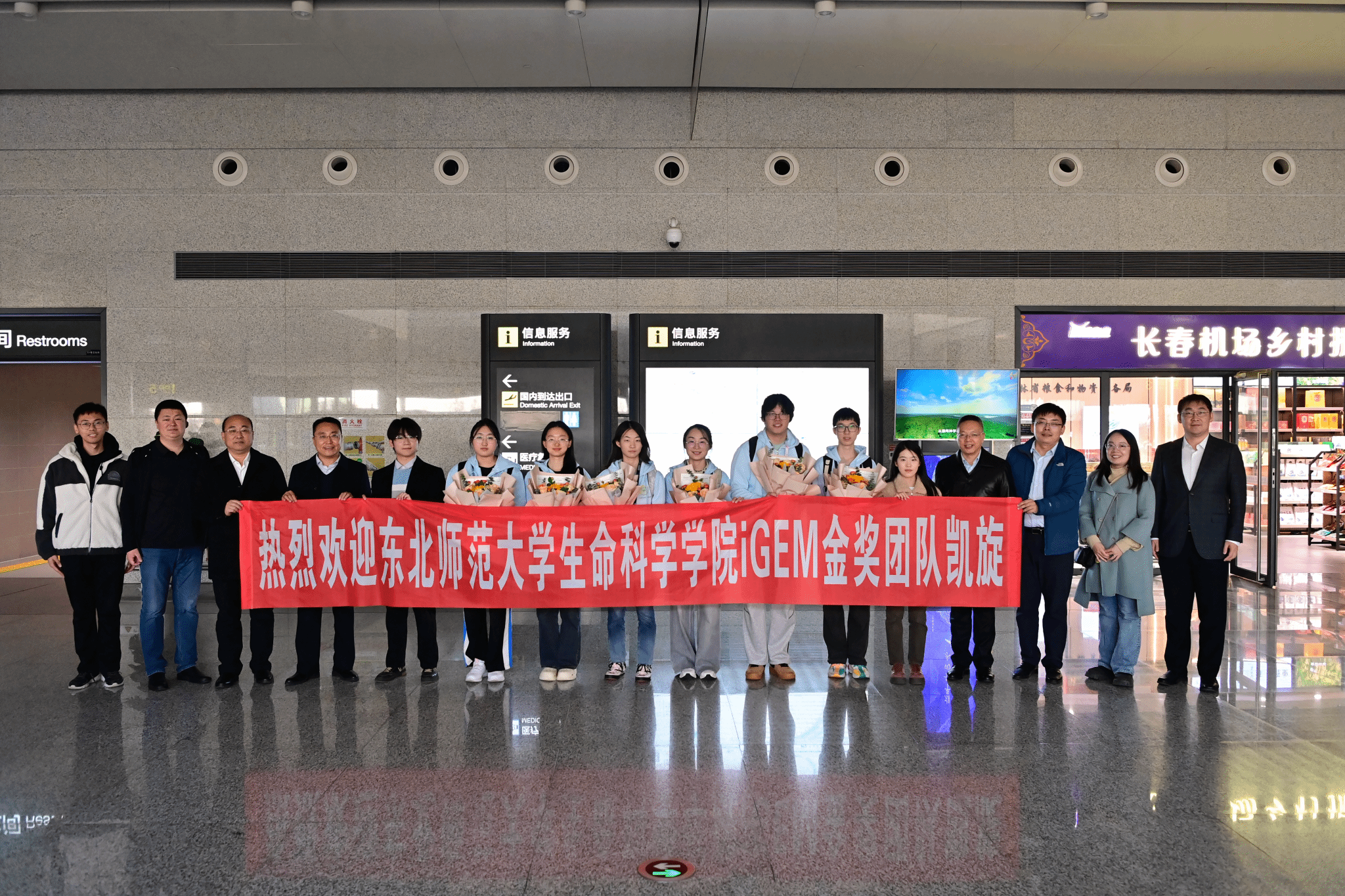 10月28日下午3点,从法国飞来的国际航班落地长春龙嘉机场。奶牛-中国战队(NENU-China)队员、生命科学学院2023级的本科生朱俊同刚走出通道,就一眼看见了鲜红的欢迎条幅和手捧鲜花的老师同学们。原来是受学校校长徐海阳委托,副校长邬志辉带队来机场迎接团队凯旋,并现场宣读了徐校长在出差途中发回的贺信。“真没想到,开学时和校长约定的场景就这样实现了,真的太开心、太感动了。”朱俊同笑着说。