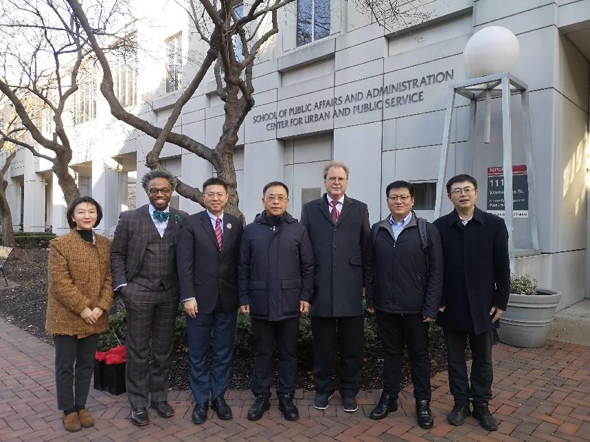 在与罗格斯大学公共事务与管理学院会谈时,学院院长杨开峰(Kaifeng Yang)、副院长亚伦(Aaron Gibbs)接待了代表团。会谈期间,双方共同回顾了两校共建公共事业管理专业的历史,杨开峰介绍了学院在课程改革中应用大数据以及人工智能方面所取得的最新进展,并期待能够重新加入到纽瓦克学院的合作办学模式之中。