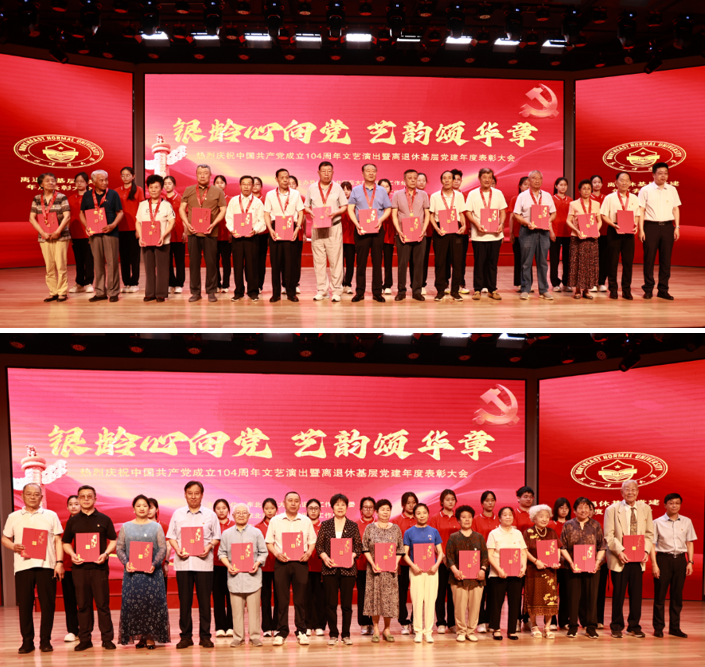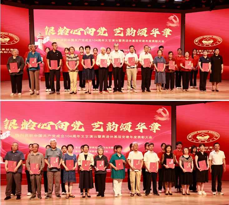 6月27日,离退休工作处召开“银龄心向党 艺韵颂华章”热烈庆祝中国共产党成立104周年文艺演出暨离退休基层党建年度表彰大会,向党龄达到50周年,且一贯表现优良的离退休党员教职工代表颁发“光荣在党50年”纪念章和荣誉证书,并对评选产生的2024年度“好党员”进行表彰。学校原党委书记周敬思,党委常委、副校长严蔚刚,以及相关部门负责人和离退休工作处党政班子参加大会。