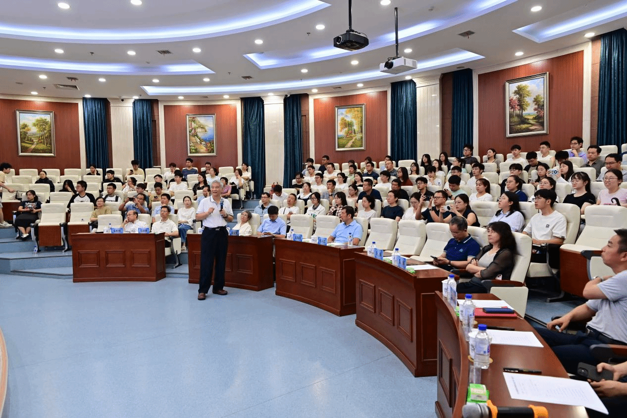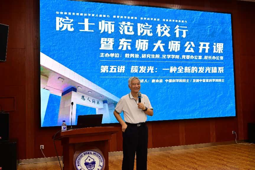 唐本忠院士以《簇发光:一种全新的发光体系》为题作报告。他首先介绍了以还原论为基础的传统发光机制,进而引领大家对整体论研究范式这一新领域进行探讨,详细介绍了簇发光新概念及空间共轭发光新机制,同时深入阐释了聚集诱导发光与簇发光的关联与区别。唐院士强调,当传统理论无法解释新现象时,正是范式革命的新契机,广大科研工作者和学生应突破还原论的思维定式,从整体论视角建立科学研究新范式。报告结束后,唐院士与参会师生进行了深入交流。