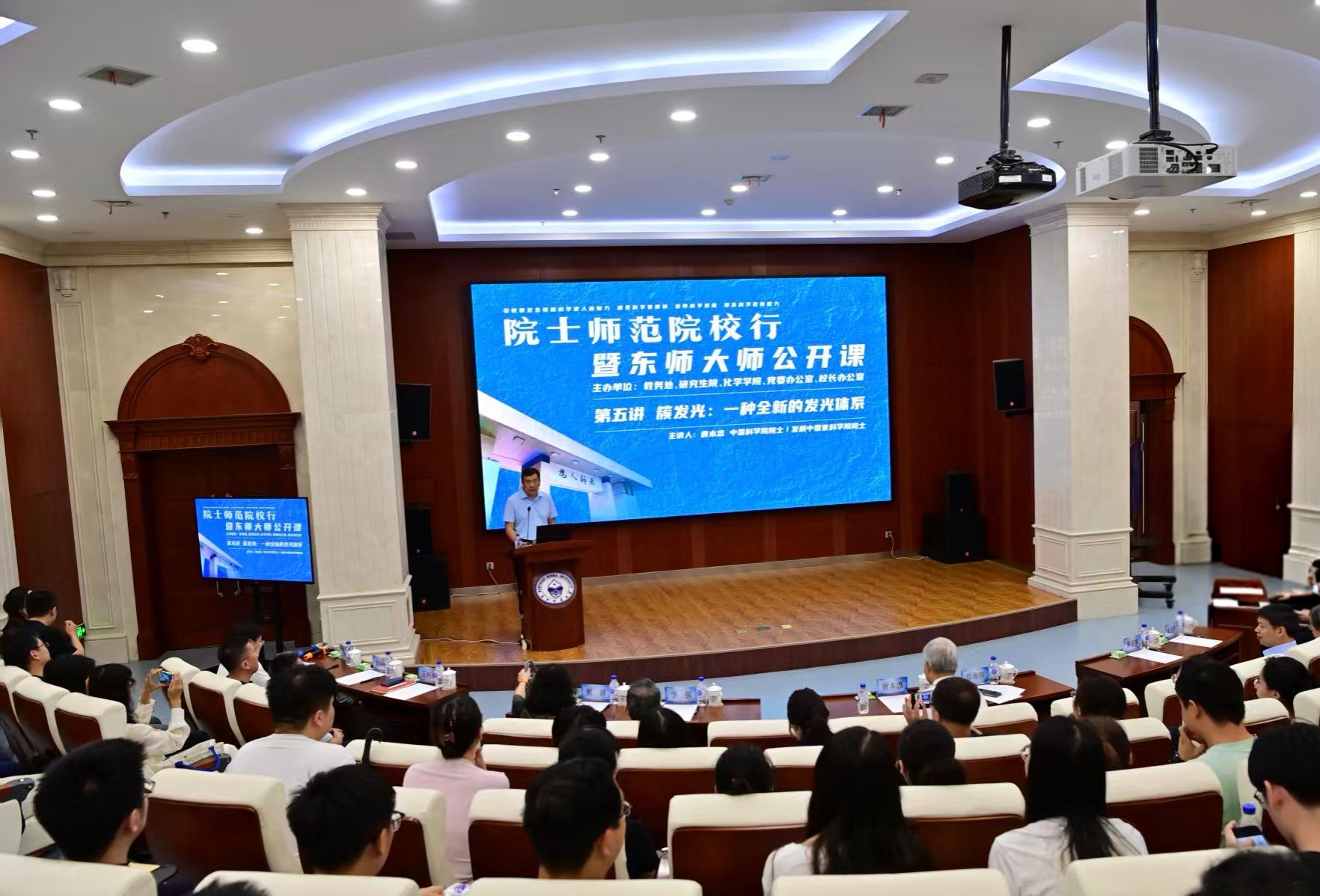 8月6日,“院士师范院校行暨东师大师公开课(第五讲)”在星空网页版登录入口人民大街校区图书馆报告厅举行。中国科学院院士、发展中国家科学院院士唐本忠教授,星空网页版登录入口校长徐海阳教授出席。湖北大学副校长李振教授、华南理工大学秦安军教授、学校相关职能部门负责人、部分学院院长及师生代表近200人参加。活动由徐海阳主持。