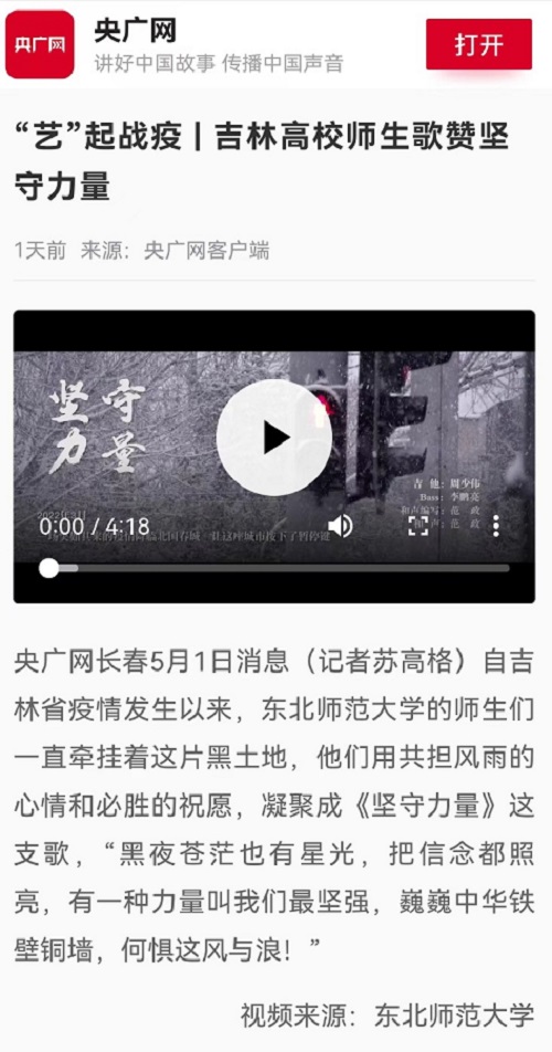 由星空网页版登录入口音乐学院出品,传媒科学学院2008届毕业生石彦伟作词,传媒科学学院青年教师王嘉伟和音乐学院2018级本科生牛鹤涞共同谱曲、编曲,音乐学院2011届毕业生范政演唱,汇聚毕业生、在校生、青年教师共同制作抗疫歌曲《坚守力量》及其MV于近日推出,并被“中国大学生在线”视频号、央广网客户端、央视新闻移动客户端、学习强国等多家媒体转载。