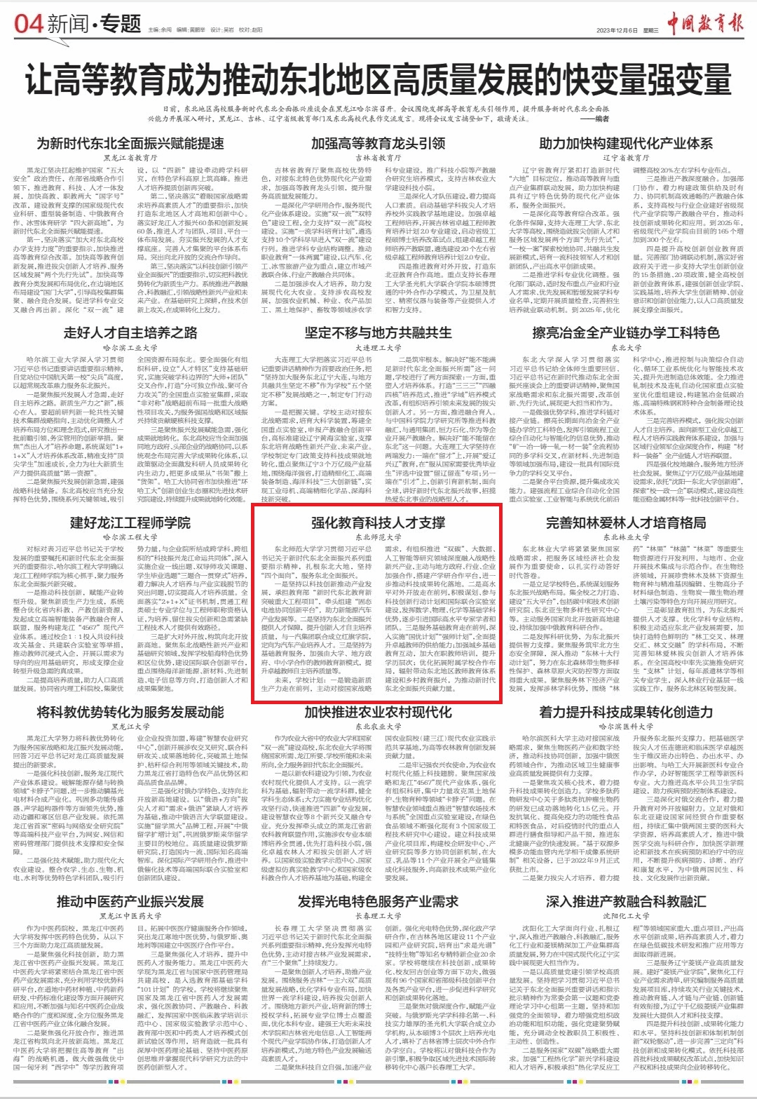 近日,《中国教育报》以《强化教育科技人才支撑》为题,对星空网页版登录入口在东北地区高校服务新时代东北全面振兴座谈会上的发言进行了摘登。